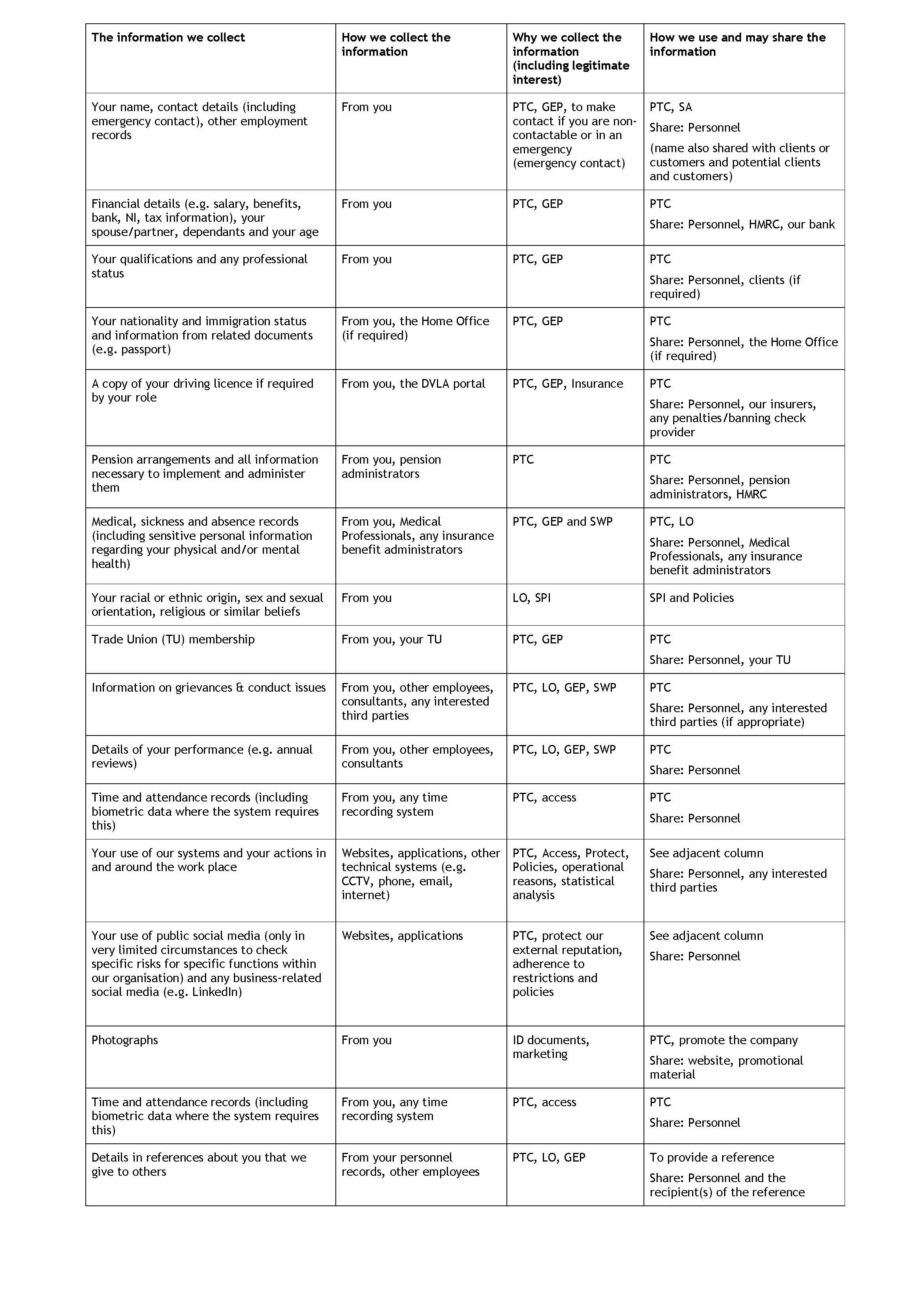 A table summarising the personal information we collect and hold, how and why we do so, how we use it and with whom it may be shared is below.